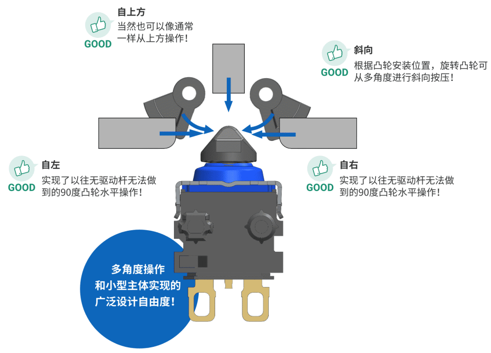 實現(1)和(2)最簡單的方法就是從正上方按壓,也就是從行程(完全按下開關的距離)最短的角度按壓。但要設計行程只有幾毫米的超微小型開關的垂直按壓并不容易。